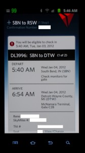 Today I want to talk about my first experience with the new Delta Android app for my Samsung Galaxy 2s. So how did it go? I had a very early AM flight as you can see above and check in did not work.