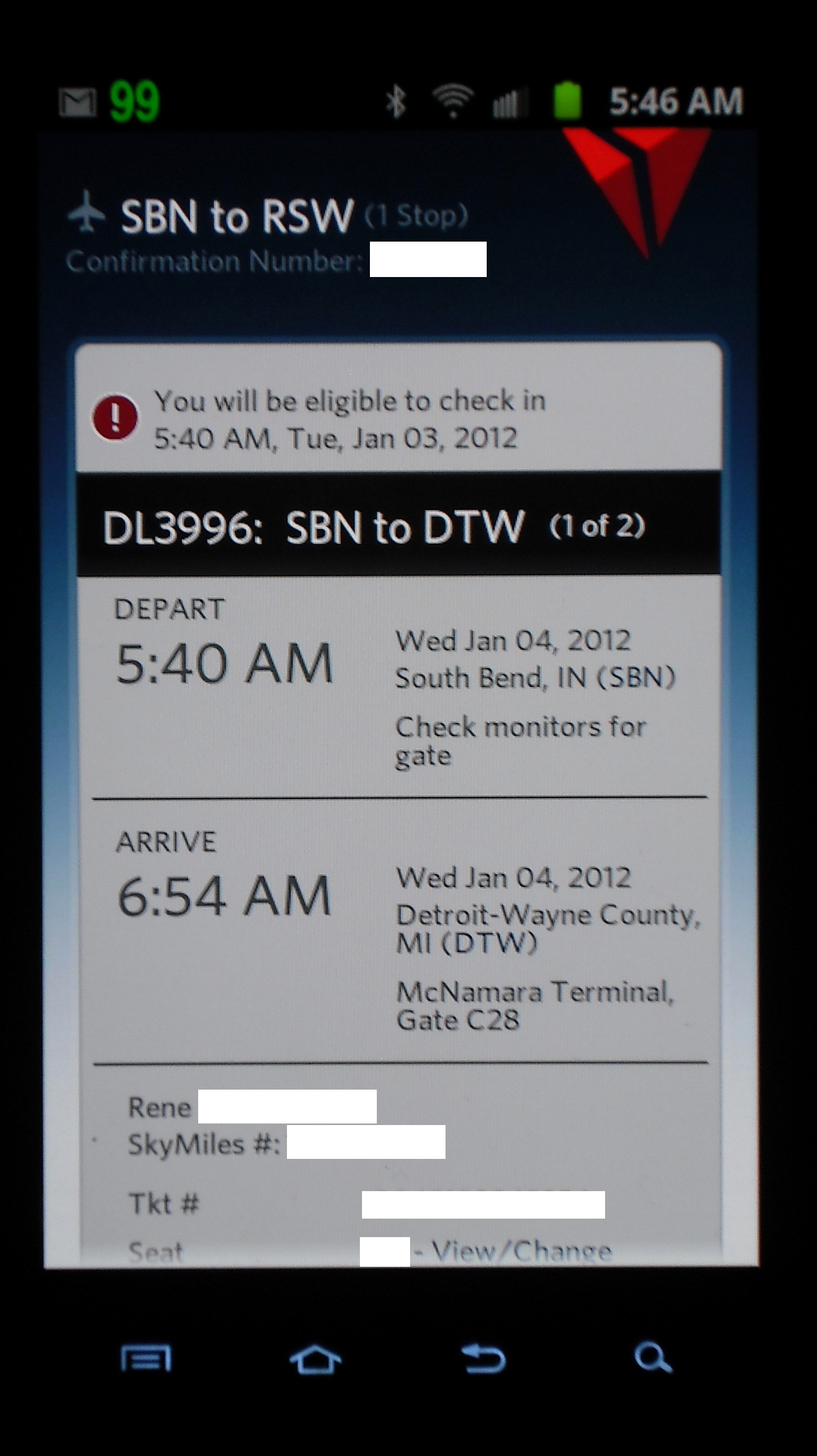 For my trip back the app was great. My return flight out of RSW was delayed inbound. Before robo-calls or emails from Delta the app alerted me that there was something amiss with my trip. I right away called the medallion line and was told I had been re-booked RSW-MSP-SBN and would get in only about 1 hr later than the RSW-DTW-SBN route. I did go from perfect seats to my group all over the plane, but at least we were on the flight so no foul and I was very impressed with both the app and Delta IT to have the re-route done so fast.