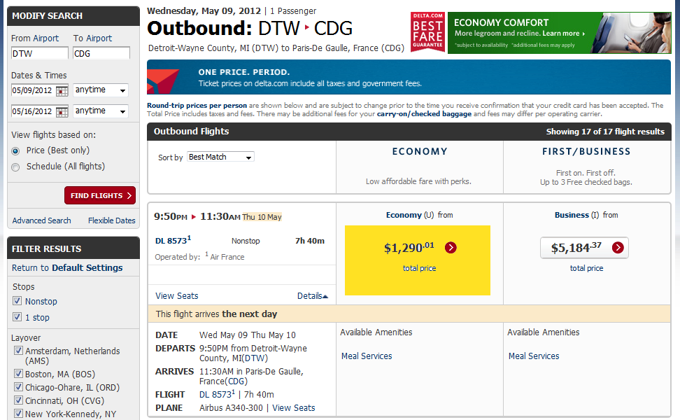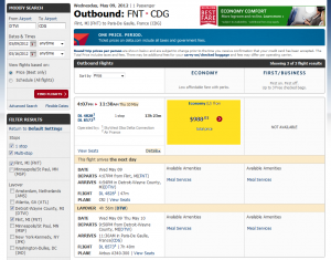 Let’s say you want to buy a ticket for Detroit to Paris non-stop. If you search direct you come up with this price below:
