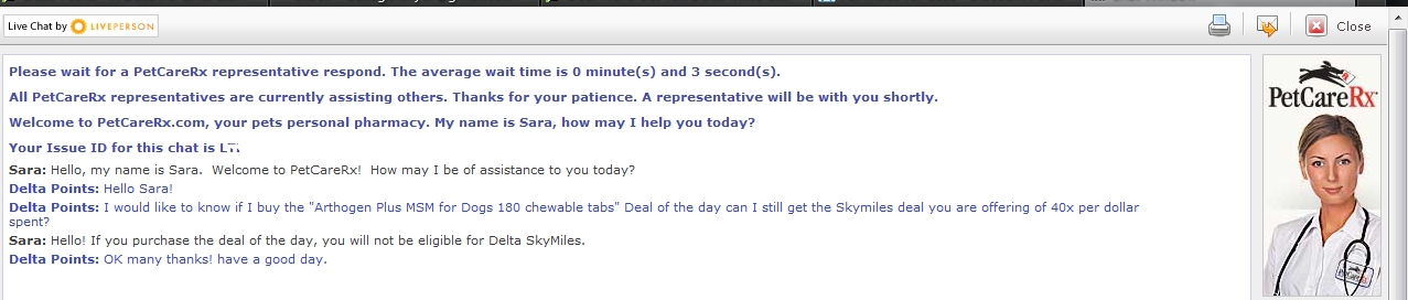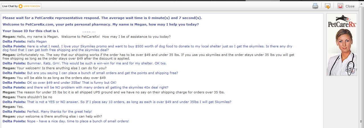 The basic deal is up to 20,000 per order or a $500 one at PetCareRx. They say via chat you can have UNLIMITED multiple orders but I would be VERY VERY careful on this one and MAKE SURE to put in your Skymiles number before you check out. AND do LOT’s of screen prints PLEASE if you do order anything!