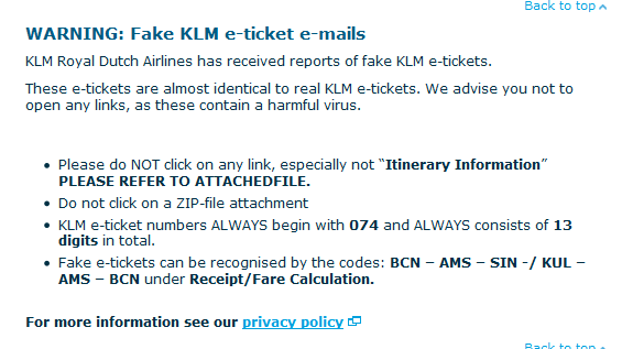 Back in June I blogged about the fact that many had been getting FAKE Delta e-Mails that sorta looked like they were coming from Delta. For most of us who know Delta, we see it is fake and ignore it. I don’t fly AA much but when these type of e-Mails come in I know they are fake, plus they look bad to my trained eye anyway. But today KLM has put up a warning as the Phishers are getting better at trying to trick us up: