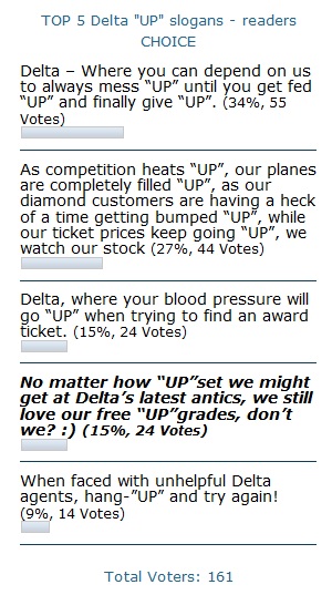 Thanks all for your input and votes and I will leave the survey up for a while just to see how it goes but at least we have our winner! Now we can only hope that our beloved airline will live “UP” to their “REAL” corporate slogan and hit some home runs the rest of this year! – René