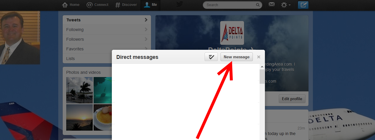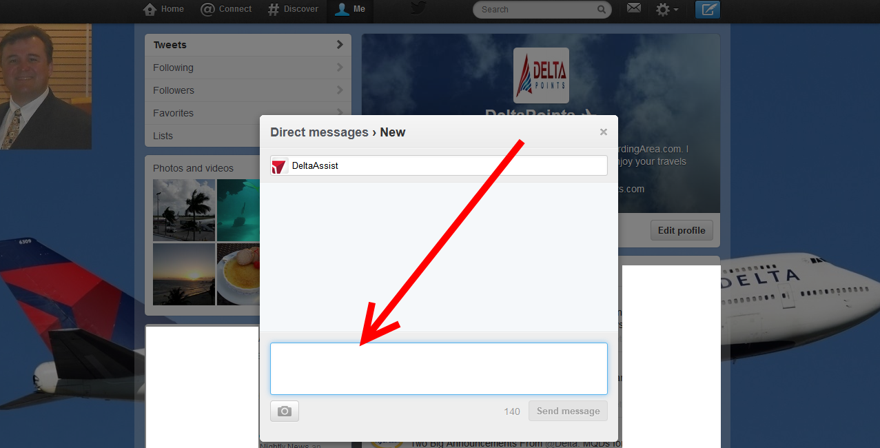 6) Then, you will want to tweet to @Delta: “Please follow ME for a DM” (Direct Message). The tweet you are doing everyone on the planet can see so never at this point give out any of your personal info yet. Just tweet them to follow you for DM!