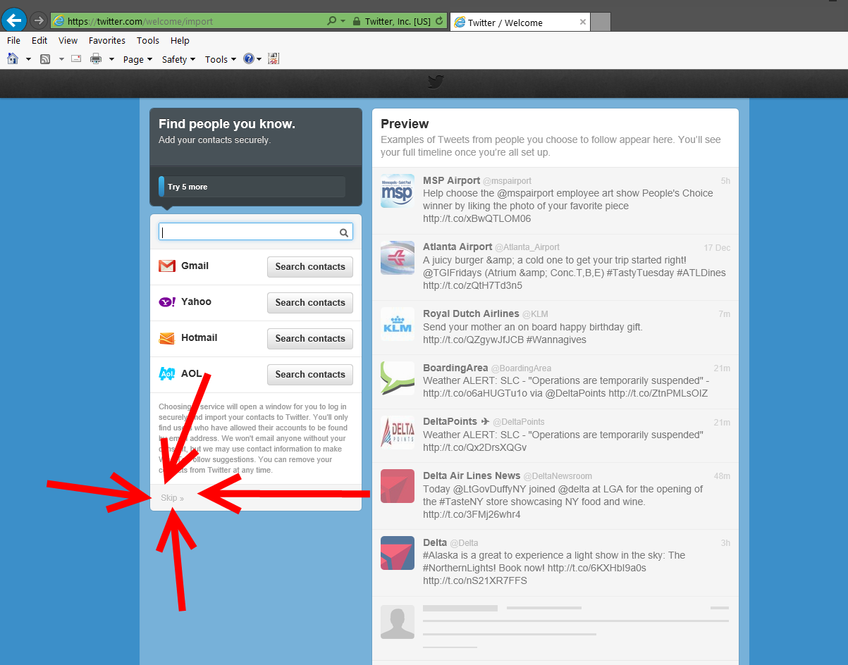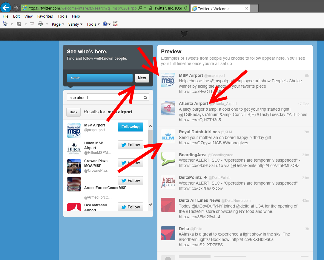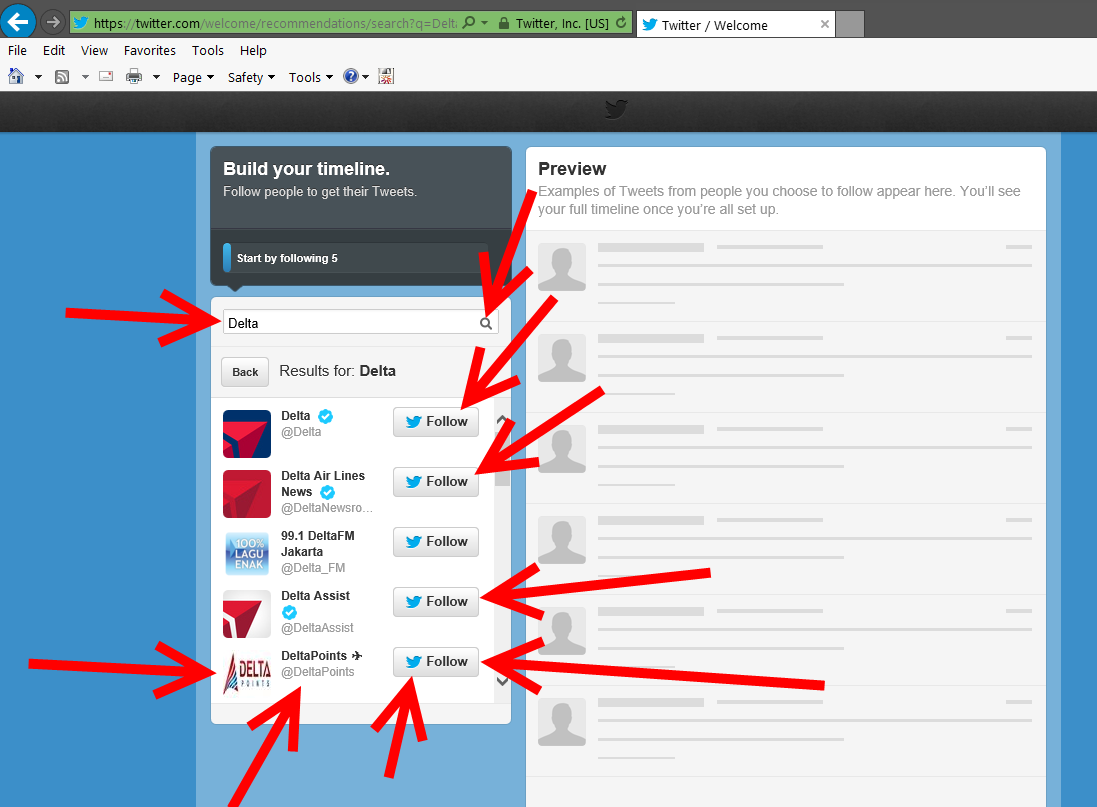 3) You now search for those you want to follow. Good choices would be @RenesPoints, @Delta, @EliteMileageRun, & @BoardingArea.