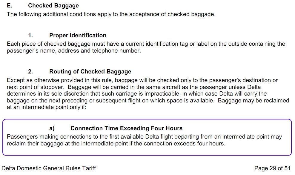 Also good to remember is that for domestic or Canada travel, anything over 4 hours is considered a stopover, and you’re entitled to reclaim your bag. For international you have up to 24 hours before it counts as a stopover, you are entitled to claim your bag after only 6 hours, and required to reclaim your bag after 12 hours. There is no mention that I can find of what time limit applies to require you to reclaim your checked baggage when traveling domestically.
