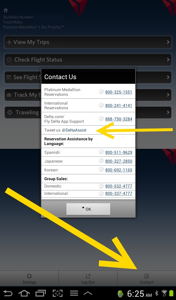 Next, phone numbers. Make sure you have Delta’s 800-323-2323 saved in your cell. This is simple but important. If you are any level of Medallion® you can check your Skymiles card for another contact number or check the Delta APP and see the number there as well.