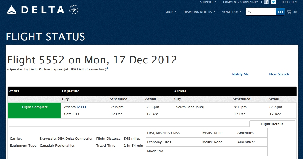 Then I truly entered the twilight zone once I made it to the last flight of the day from ATL-SBN (Delta had rebooked me on an AM flight and my guess is, had I gone to a self service kiosk, a free hotel night voucher and dinner and breakfast coupons would have come out). Our regional was run by ExpressJet that is owned by SkyWest. Jerry was our FA and was training Jessica. Jerry was, well, great and different. I really did not know what to say. He was entertaining (a bit over-the-top) with the safety demo, but I did listen and that is saying a lot! He then took his list and personally thanked EACH medallion on the flight. On a CJR, really – Jerry, who are you? Wow! Then, for those GM+ he said 1st round was free. What, free Woodford? (I said no as I had enough “CayBrew” for the day already). Then, just before landing, he went through the cabin with a tray of candies & mints etc. that looked like it was personally purchased.