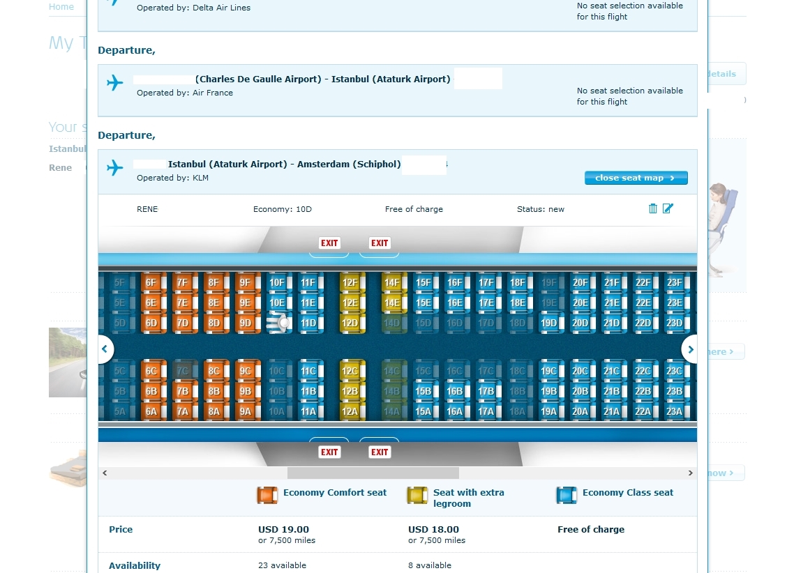 As you can see, you can pay for EC seats or exit row with USD or FB points if you have some. If you are a Delta Medallion® I would personally not do that. I would grab the best seats FREE in coach so you at least have a “good” seat and then once you get “over there” go to the KLM crown room or AF lounge and see about getting exit or EC for free. They will give you a snaky look, but if you remind them of your Skyteam elite status and explain how you would so much appreciate it, they will most of the time help you out.