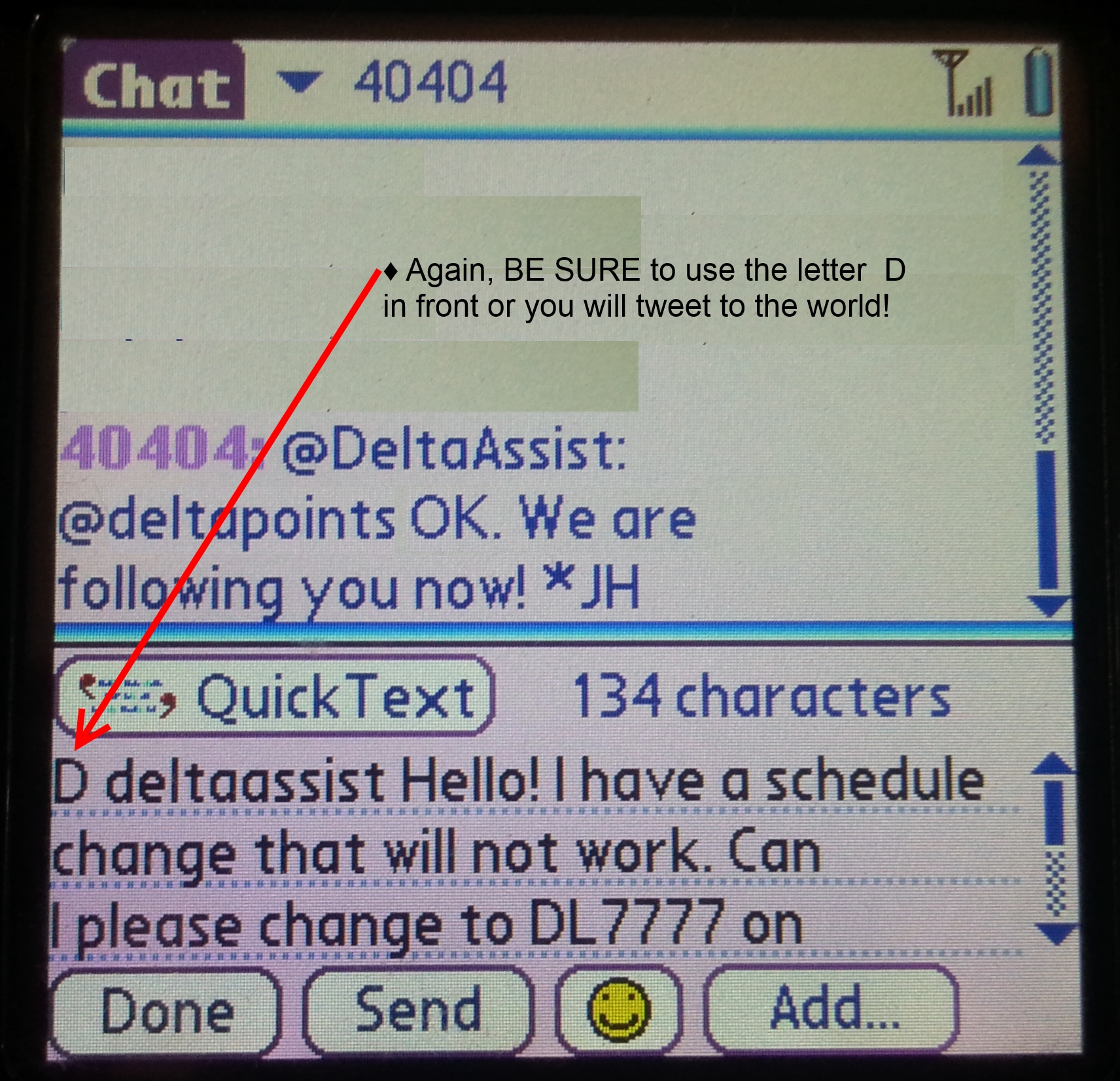 If you followed the above steps, and did put your phone into your twitter account, you are now good to go! It is that simple and all you have to do is keep the number 40404 in mind for twitter use. Next, again after DeltaAssist is following you, you can send them Direct Messanges that no one but they can see. This is how you do that (without the brackets):
