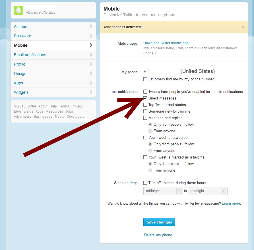 So what am I talking about. First, you do need to, as I talked about before, find a computer and setup a Twitter account and ask @DeltaAssist to follow you as per the instructions in that post. Once that is done, go to mobile and add your phone number: