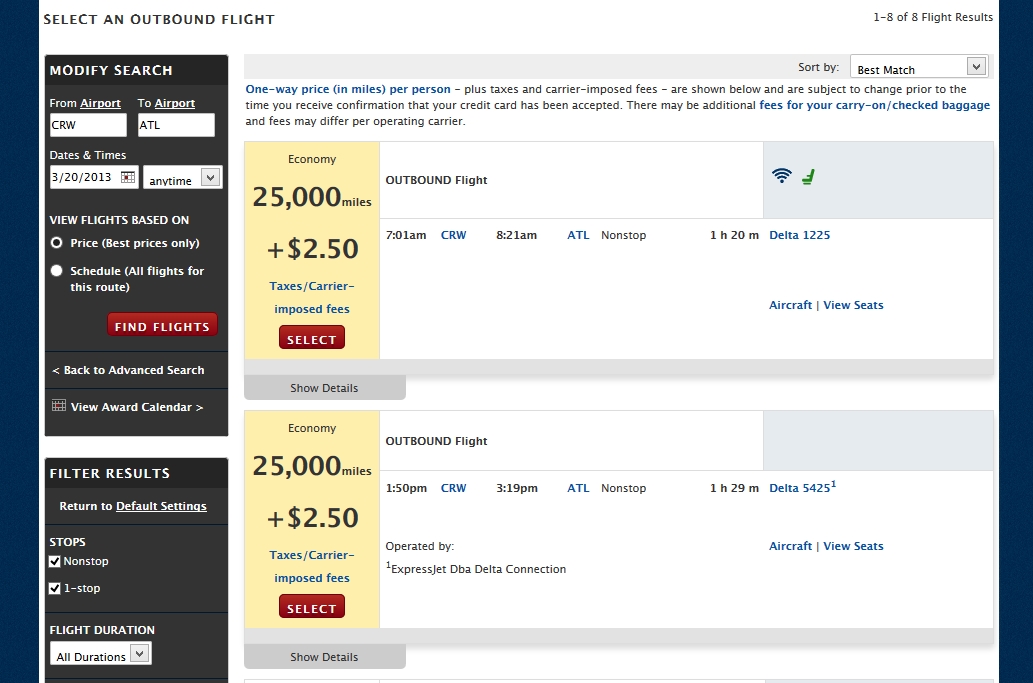 Trying to find a flight NYC-CHS from 5/22 – 5/26 and seeing nothing but 40k. I tried leg by leg and found JFK-CMH-ATL-CHS at 32.5k miles (not 25k but still lower than 40k), however when I put that itinerary in to multi-city, the result came to 72.5k. Seems like there’s no way to force 25k