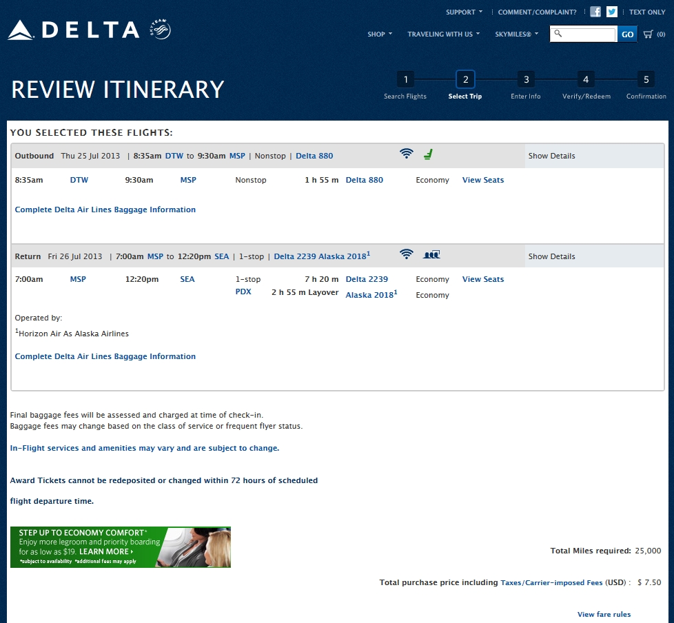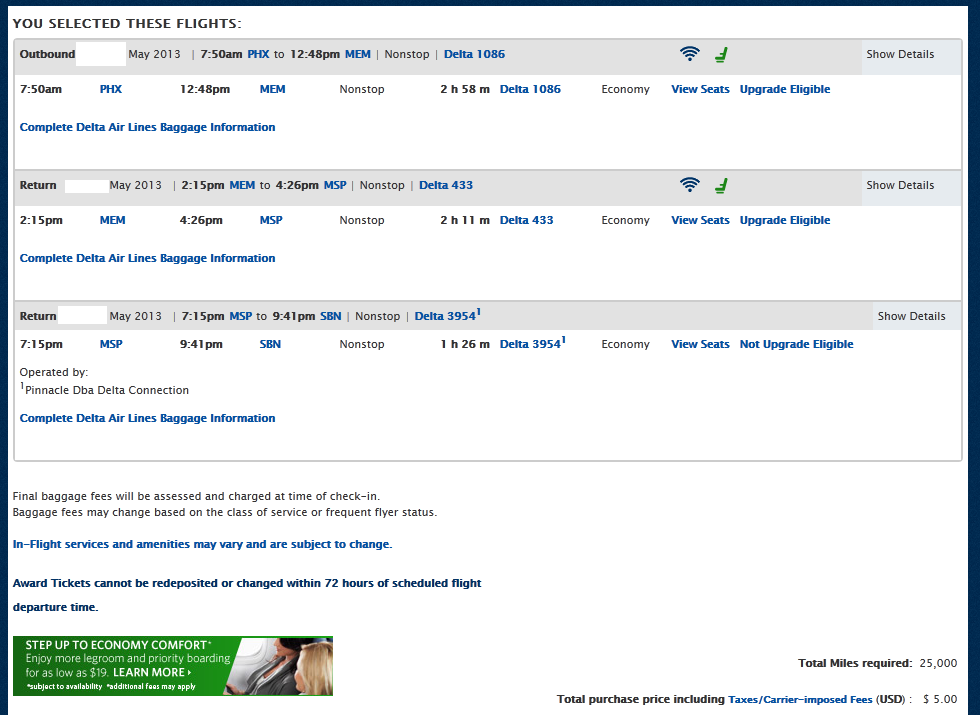 Again as you can see from the photos above, by plugging in PHX-MEM-MSP-SBN at Delta.com, I am able to find the low level seats I want for my return at low level award points.