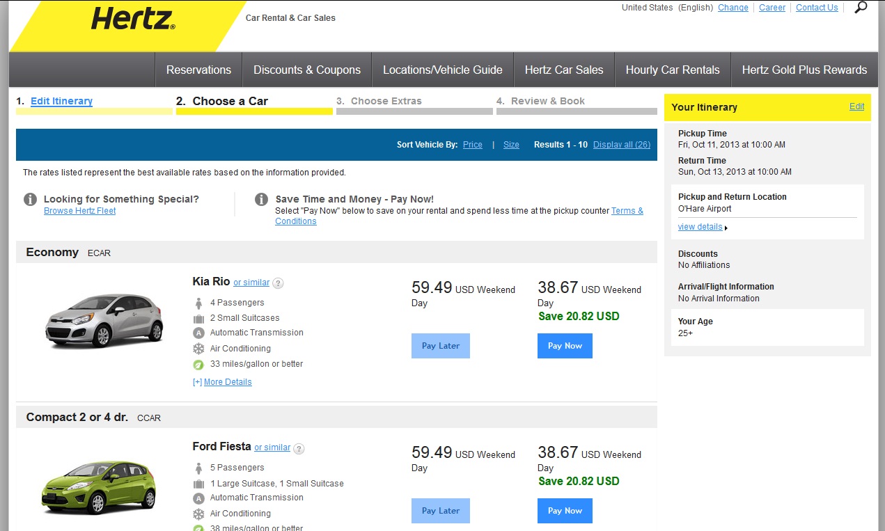Ah. $118 plus tax. So, not such a great deal. Once we add Chicago tax it gets a little better but still not full value. Then let’s forget about the hotel, how about a rental car so I can get around Chicago?