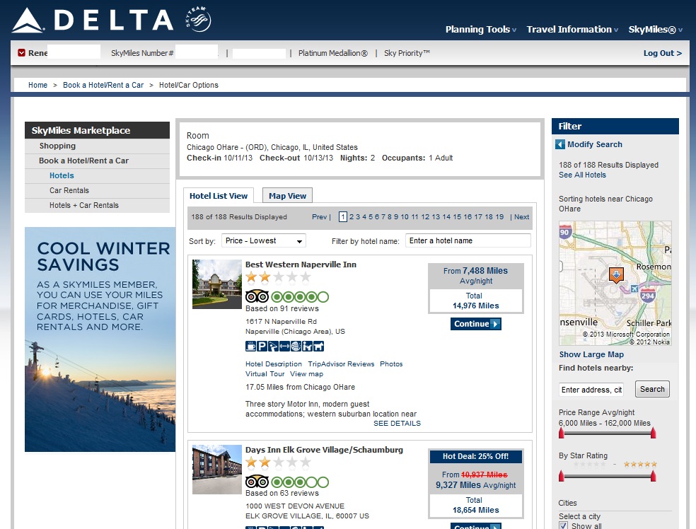 OK that is a gift card. What else? How about this. The Chicago Seminars this year is OCT 11-13. Say you want to spend Skymiles to book a hotel. Let’s take a look.