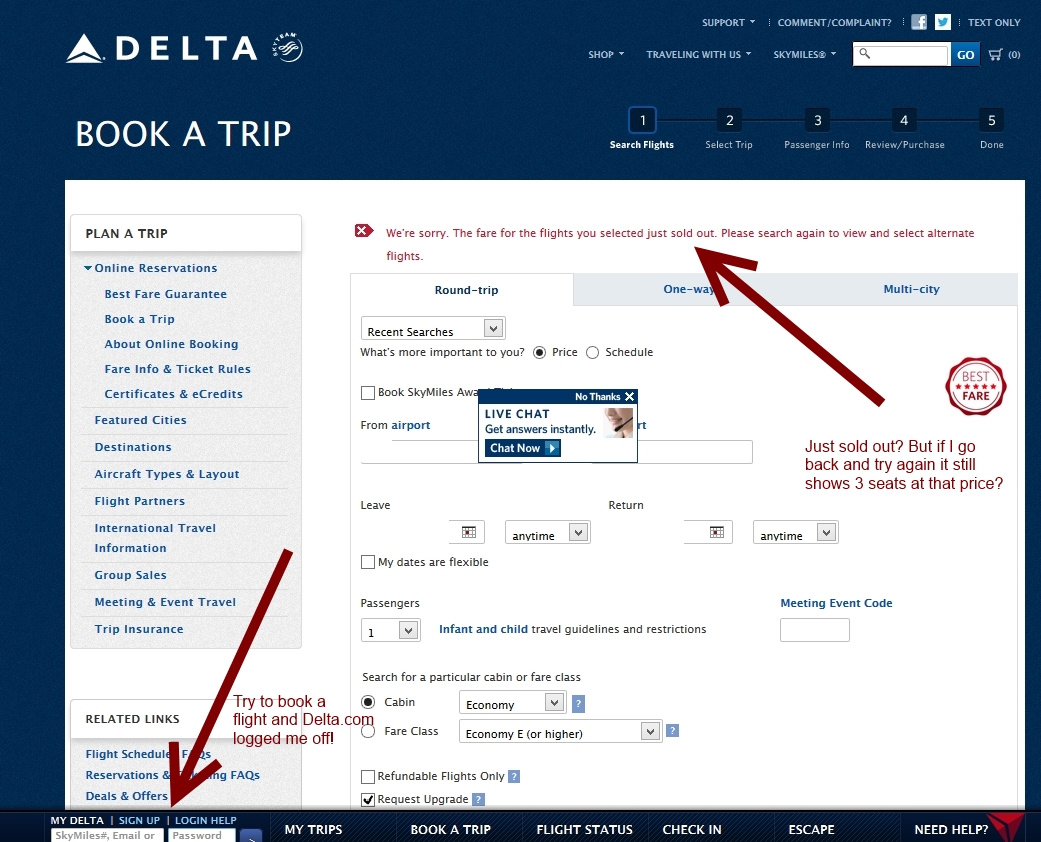 We also know how broken the award booking part of Delta.com is, but there are just some things that should work and work really well. Like booking and buying a ticket should be one of the things that just works and works perfectly. Delta has had issues in the past about one fare class being shown when you are NOT logged in and yet another when you ARE logged in, but it would change when you went to buy and that has been fixed and is not what I ran into. As you can see, Delta.com clearly says there are seats for me to buy. But when I go to buy: