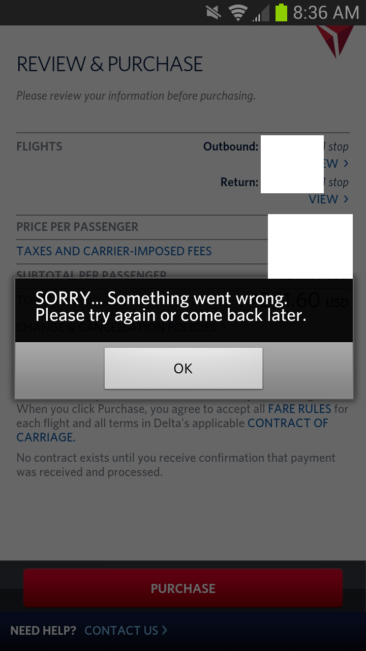 Then I decided to try to buy the tickets with the handy dandy Delta phone APP. As you can see from the above, it also showed there were seats to buy, but errored out at the last step! Grrrrr. So I am forced to call the Platinum Medallion® line and the rep finds in her system a slightly higher price than Delta.com and the Phone APP showed and thus the reason I could not buy!