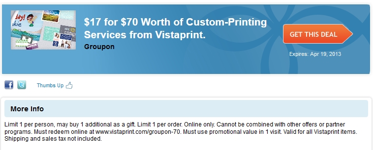 - Step five when you get the coupon go to: www.vistaprint.com/groupon-70