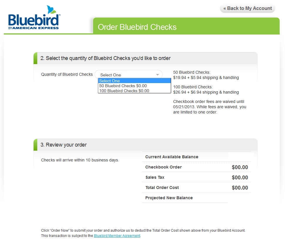 You can also order checks from Bluebird, right now they’ll send you the first 100 checks for free if you order by May 21, 2013 [edit: reports say now until 01JAN2014] (click on the “My Account” and order checks is the last menu item).