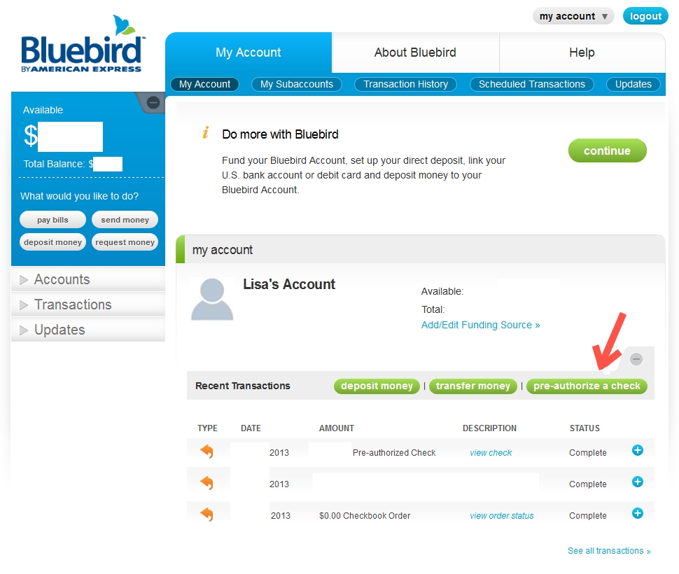 These checks work a little differently than the checks you get with a regular checking account. These checks must be pre-authorized before you can actually use them, but it’s a really simple process. Once you receive your checks, you just log on to your Bluebird account and click on “Pre-Authorize a Check”