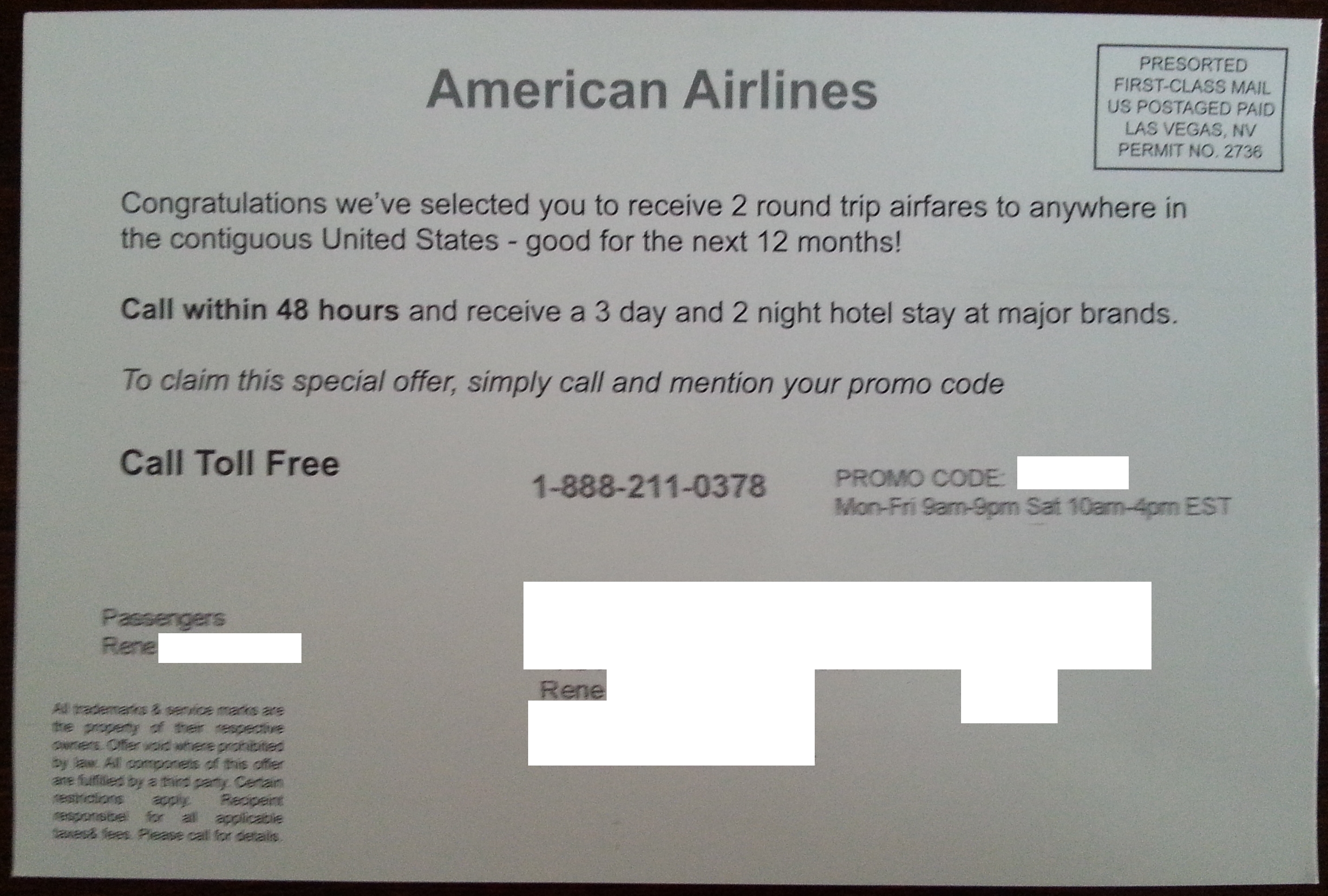 When I did just the slightest digging with the “promotion name” and the phone number just look what popped up HERE. Ah ha, this is a timeshare deal. They have sent out these post cards with SW Air, Delta and I bet a whole bunch more.