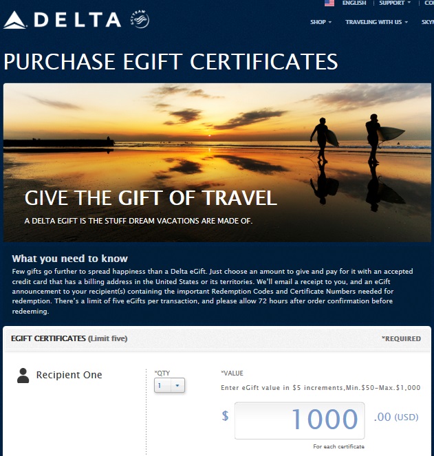Delta launches e-Gift cards up to $1000 each and 3* per ticket!