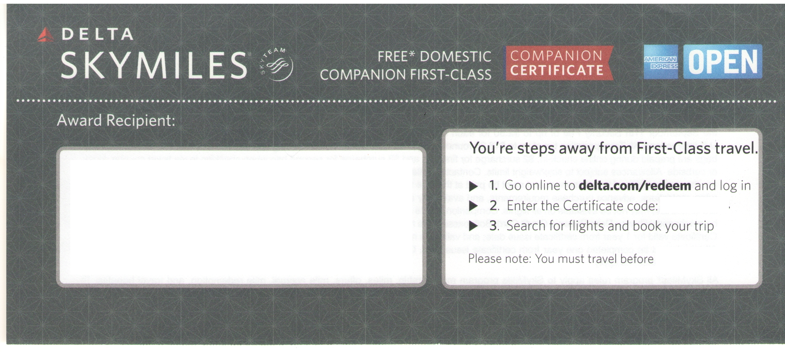Have the Delta Platinum AmEx and have received one certificate. I found it very easy to redeem and especially like the capability to redeem it electronically.
