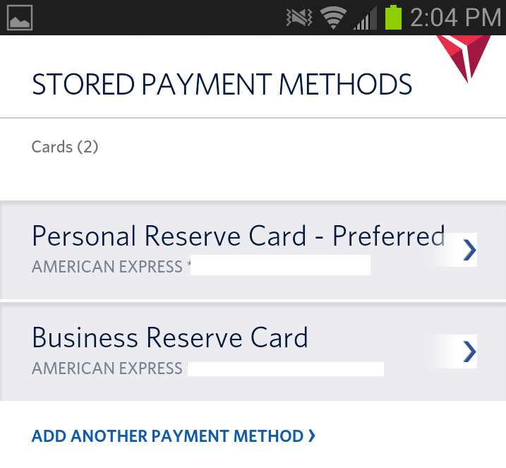 You can see all the credit cards you have stored. In my case, both my personal Delta AMEX Reserve card as well as my business Delta AMEX Reserve card as a backup.
