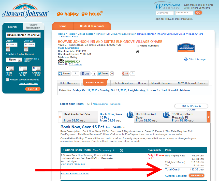 If you do a search you will find not ALL hotels in any area show up. There are limited ones that participate in the program. But Howard Johnson’s hotels are not all that bad. Is spending 26,000+ Skymiles a good deal? Well if you do “Pay with Miles” on a Delta ticket we know you can get 1 cent each for a ticket so you are in effect spending $260 for the stay or $130 per night. Is that a good price? Let’s see if we just go try to book a room at Howard Johnson’s web site and see:
