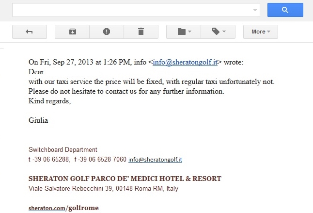 Then the hotel features. I like Sheratons as a chain. I also liked the fact that for 5 Euros each we could get a round-trip ride into the heart of Rome and the shuttle ran fairly often (gosh I am happy I decided against renting a car). Lastly the trip out to the airport would run just 8 Euros each. All this worked for me.