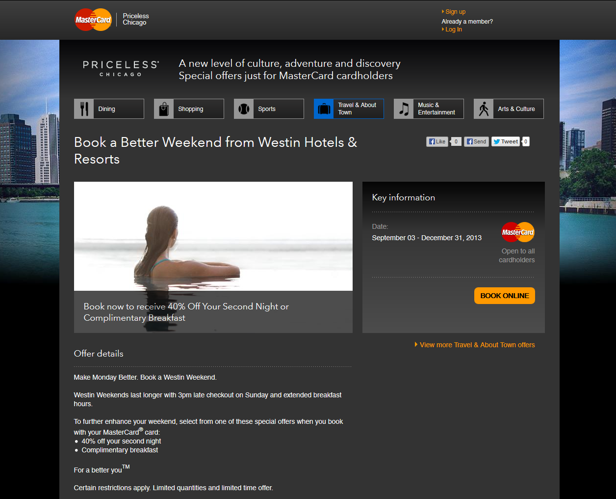 World MasterCard®, I have for my second night stay the chance to get 40% off (see T&C below). I tend to stay on points as much as I can but this is just one of many deals going with this campaign from Mastercard so why not check it out if you are in Chicago or your home town and see what else you can find. – Rene