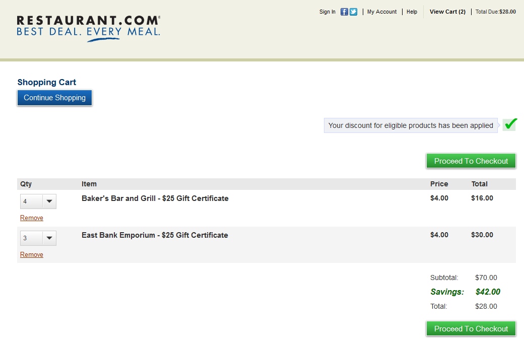 Right now, with the code ENJOY , Restaurant.com is giving you 60% off the price of the dining coupons. Not as good as the 80-90% off they had a few years back, but still the math works. Take a look.