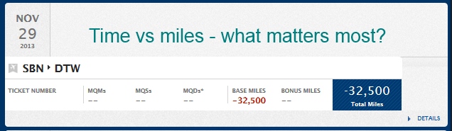 This winter Lisa & I have a TON going on and time is limited to say the very least. So, we have a chance to go for just two days of fun with my “crew” from out west. Time is THE factor in all of this. We must fly out of SBN as even a longer drive to AZO could impact the timing. I found low saver seats for the return leg at 12,500 but the outbound was mid at 20,000 so the total round trip came to 32,500 each. Considering what a ticket would cost to purchase for us two out of SBN ($500+ each) this is still a bargain but I am burning up 15,000 more Skymiles than I would like total across the two tickets. Ya know, in this case for the perfect flight times, it is worth it!