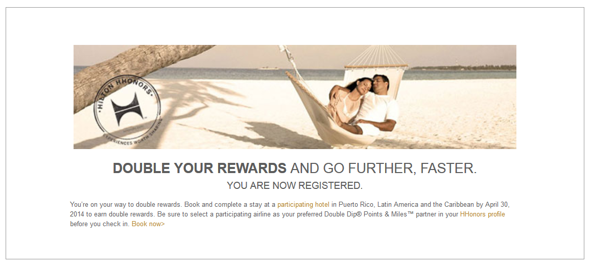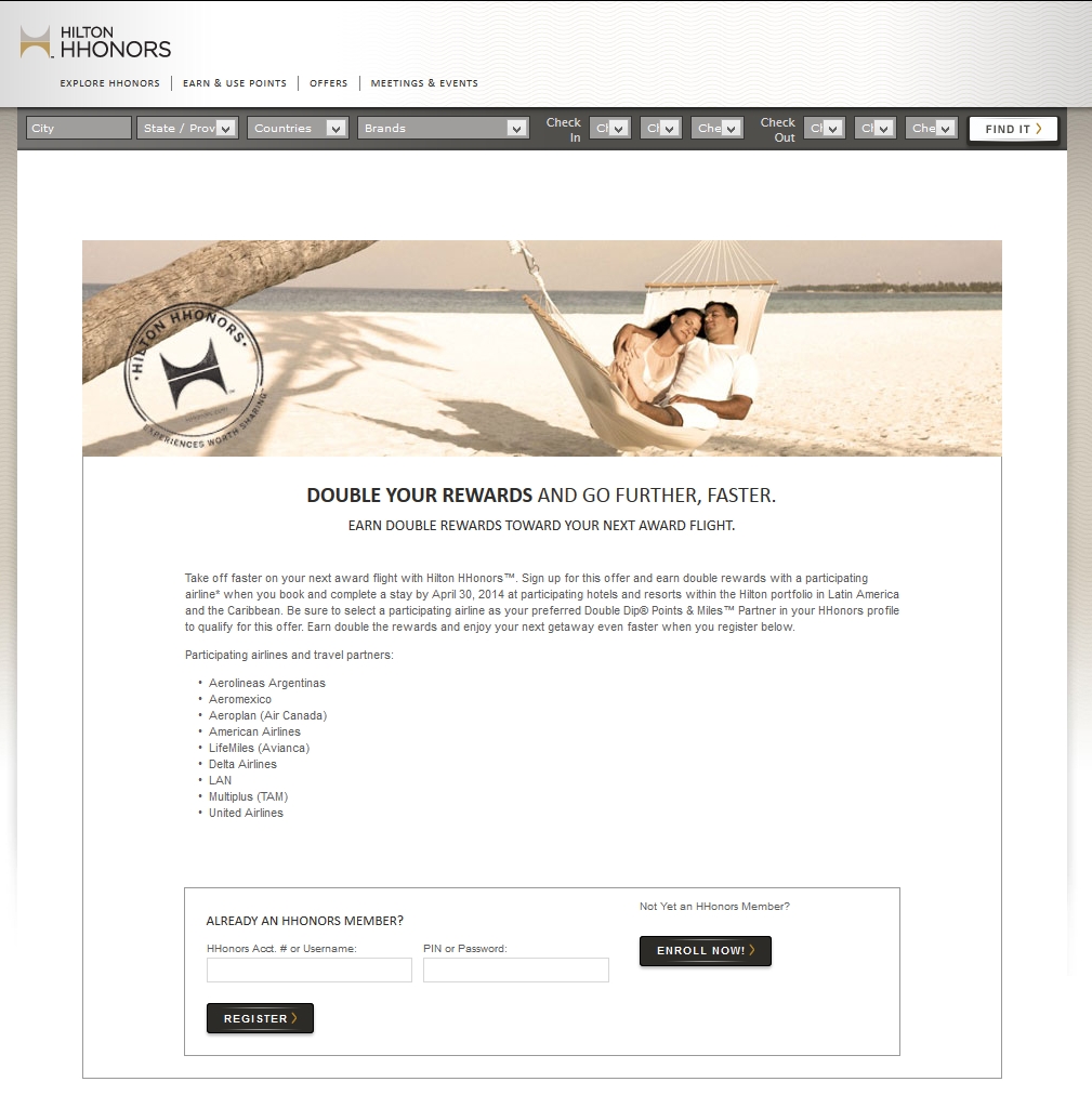 My fellow BA blogger Loyalty Traveler Ric Garrido popped up this promotion yesterday with all the T&C of the Hilton Latin American & Caribbean offer. However, one thing that bugs me about Hilton is they make promotions so hard to register for on their home page and there is always fine print (i.e. you can register but then not have some setting right and thus not get the points you thought you were going to get)!