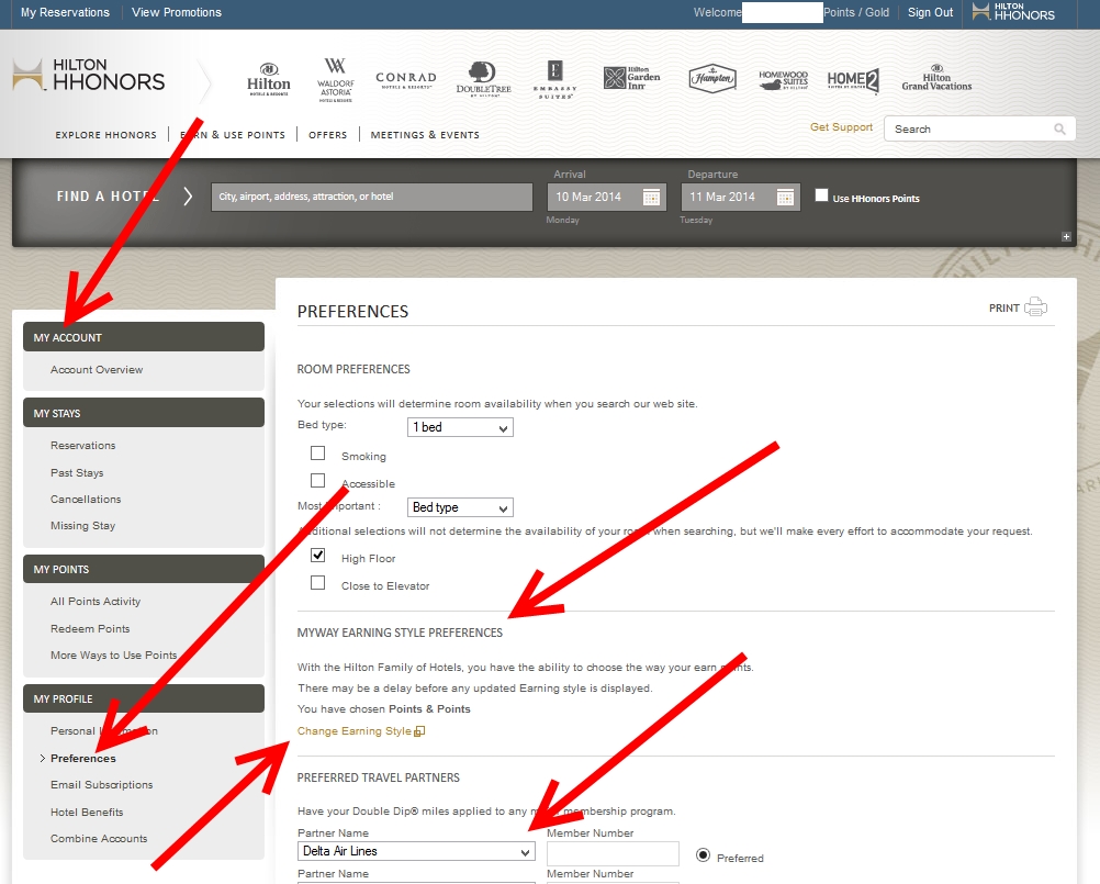 Once you are logged in to Hilton then go to My Account and Preferences. Then My Earning Style Preference and finally Change Earning Style (oh and be sure to put Skymiles and your Skymiles number in too!)!