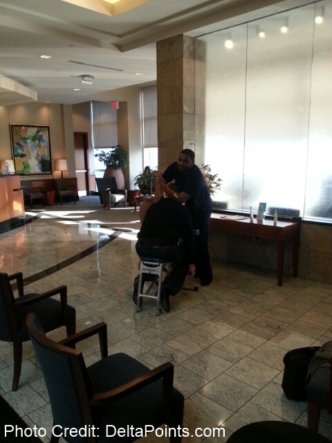 Let me tell ya the new Merlot is better than the swill they had before. The 3 bean chili is tasty but perhaps not the best choice for people about to board a plane (sorry all in 1st class). The other snacks are OK but the chip and dip needs more fire. The massage is by a rep from “Be Relax” and was very nice. I tipped him as he went “deep tissue” and I liked it (M-F 2-6PM btw).