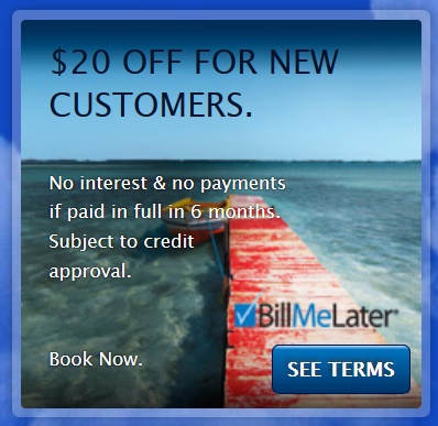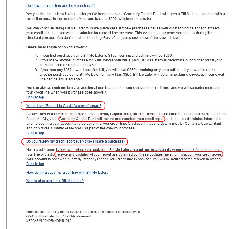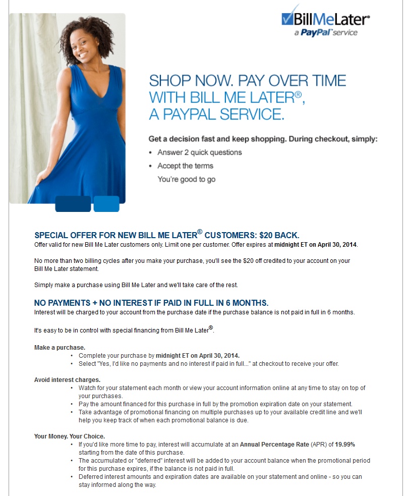 The offer is: “SPECIAL OFFER FOR NEW BILL ME LATER® CUSTOMERS: $20 BACK.” Hey who does not like $20 bucks back. But what is the cost to you to get this? The T&C are very telling and we should take a close look. It says