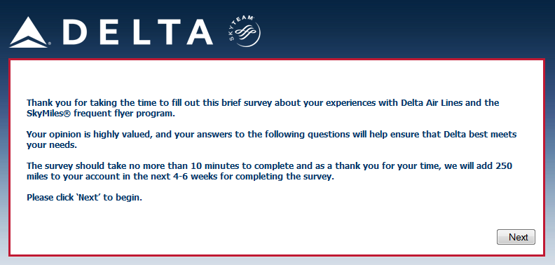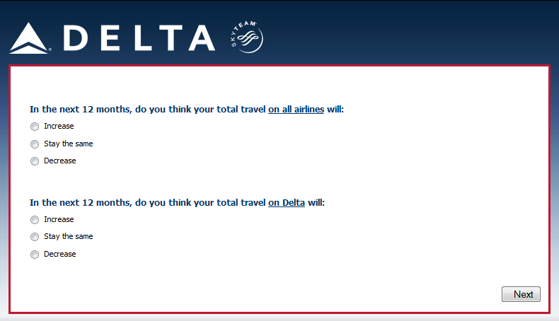 Thank you for taking the time to fill out this brief survey about your experiences with Delta Air Lines.