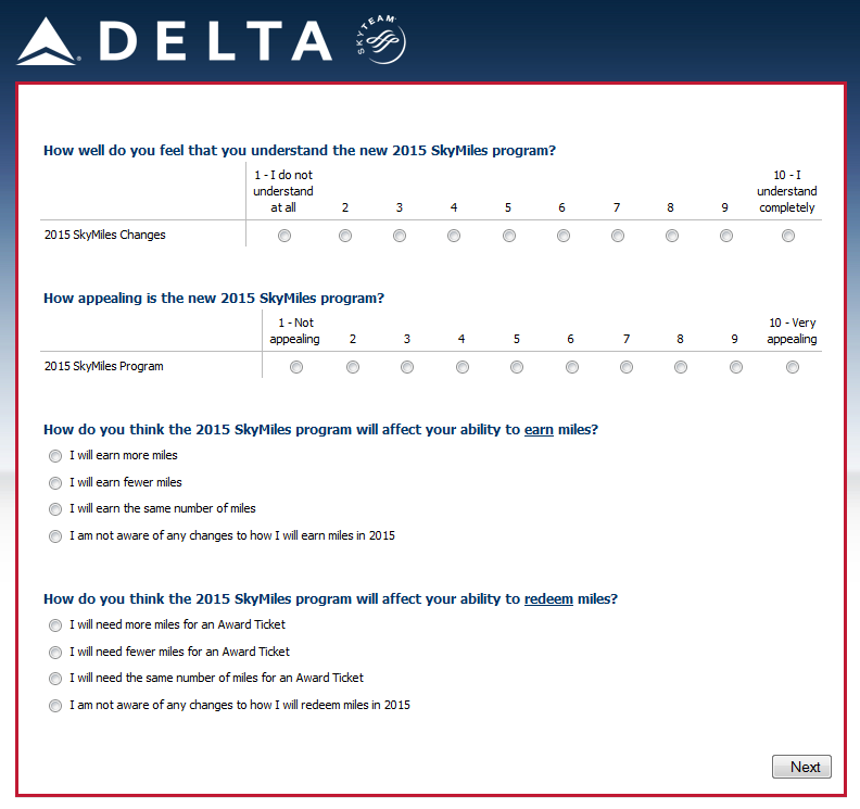 Once again I get a survey of what I think about Delta and Skymiles2015. Let me think of how many ways I can express my feelings about the decimation of Skymiles after my last survey about the program. Hummm… I will just today pass along the slides without comment.