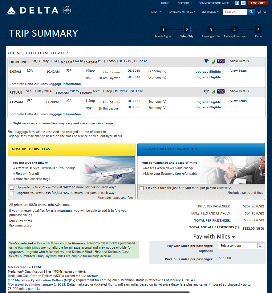 With a HT to Louie for getting my “nose” sniffing around for this one there are some nice prices all around the PSP area. This one could be (the LGA-MSP leg) 2x MQM eligible but even without it, it is not all bad and here is why. You can do the run on a weekend and no redeye (yeah you are getting up middle of night to take the AM flight to start but so what you NYC folks are tough right!)! Here are the details: