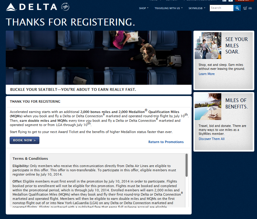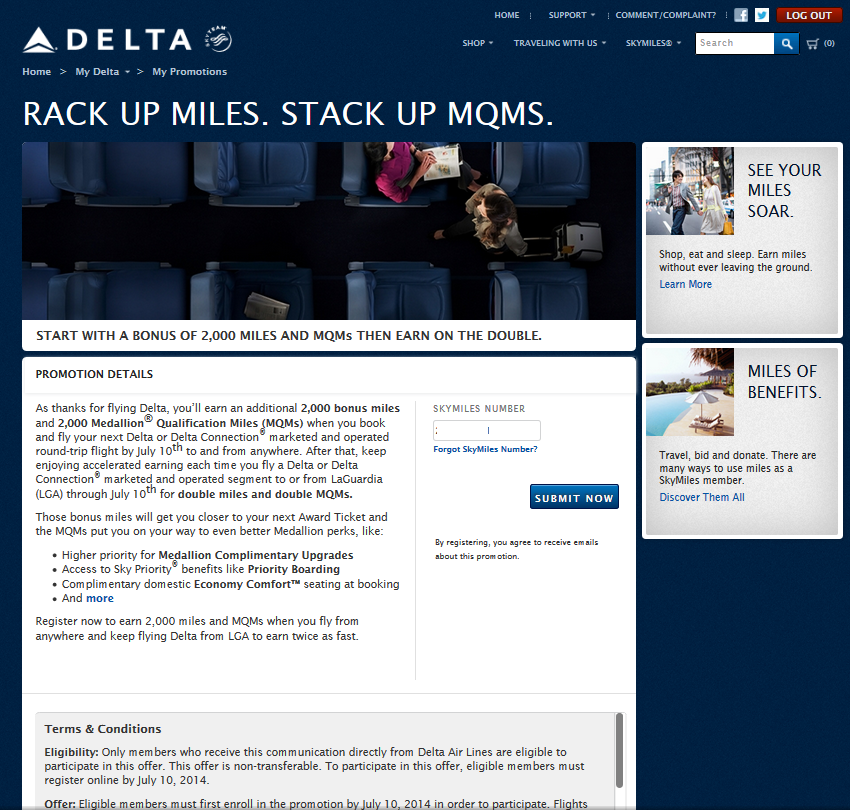 Offer: Eligible members must first enroll in the promotion by July 10, 2014 in order to participate. Flights booked prior to enrollment will not be eligible for this promotion. Flights must be booked and completed within the promotional period, which is through July 10, 2014. Enrolled members will earn 2,000 miles and Medallion® Qualification Miles (MQMs) when they book and fly their first round-trip Delta or Delta Connection® marketed and operated flight. Members will then be eligible to earn double miles and MQMs on the first nonstop flight out of or into New York-LaGuardia (LGA) on any Delta or Delta Connection marketed and operated flights. Flights purchased with a published fare that earns full mileage accrual are eligible. Codeshare flights operated by carriers other than Delta are excluded from this offer. There is no limit to the bonus miles and MQMs that can be earned within the qualification period. Double bonus miles and MQMs will be awarded on base miles only and will not be awarded for mileage bonuses, including Medallion® mileage bonus, or other class of service mileage or MQM bonuses.