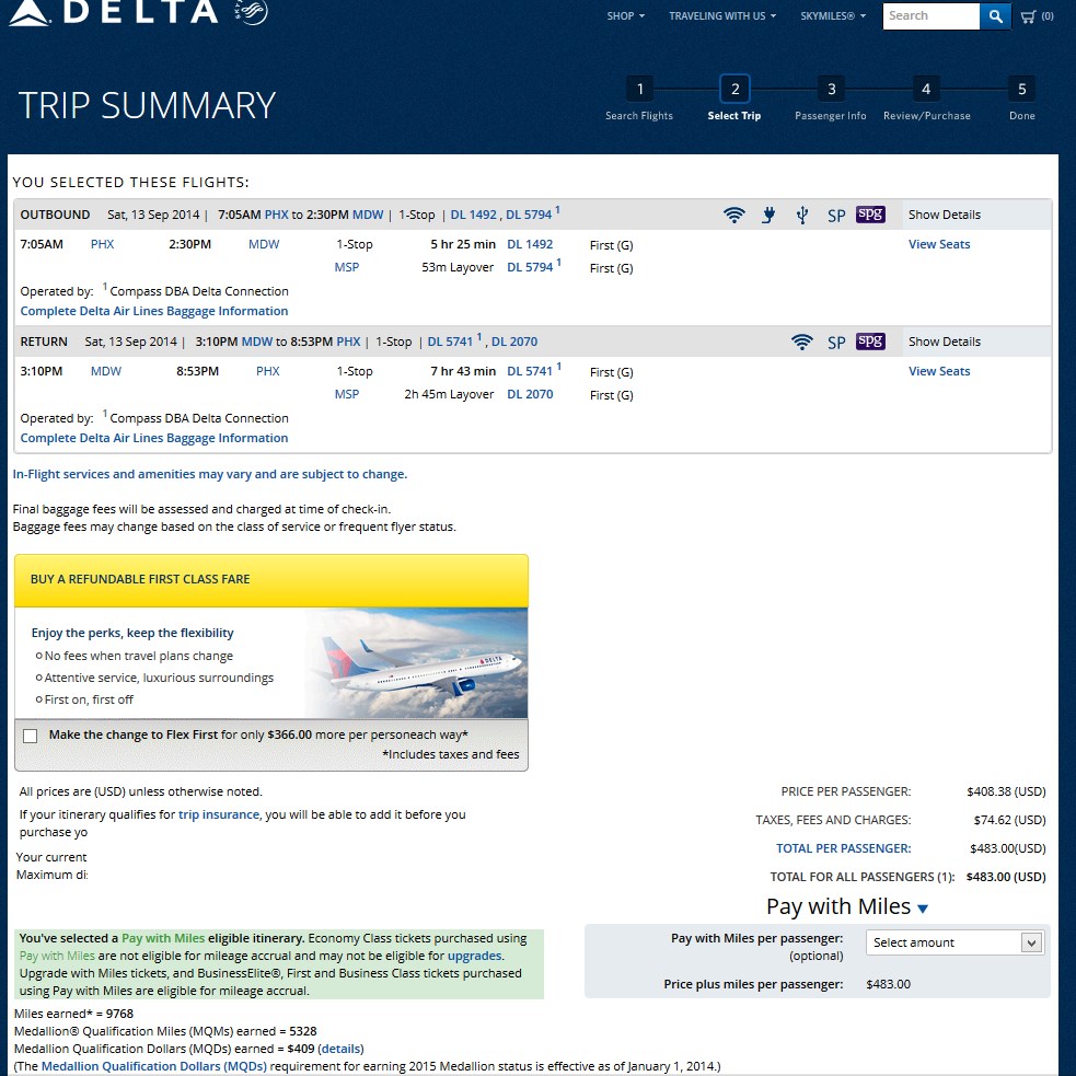Phoenix to Chicago 1st class $483 & 5328MQMs at 9.1CPM WEEKEND Delta Mileage Run