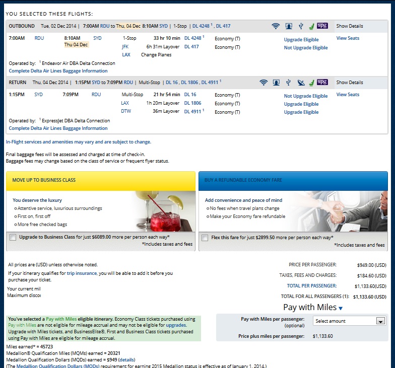 Raleigh–Durham to Sydney Australia $1133 & 20,321MQMs at 5.5CPM – weekday Delta Mileage Run