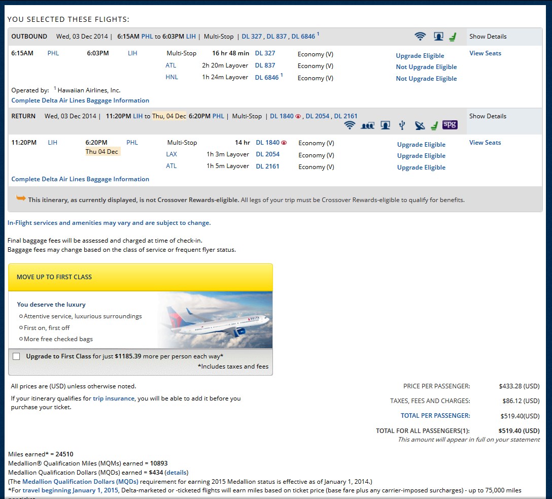 Nothing wrong with this one and a HT to TFD. Full upgrade shots if you AVOID ATL-HNL direct flight but the most miles that way and lowest CPM. A two day trip and a ton of points and sip a tropical drink before your trip back = win=win! Here are the numbers: