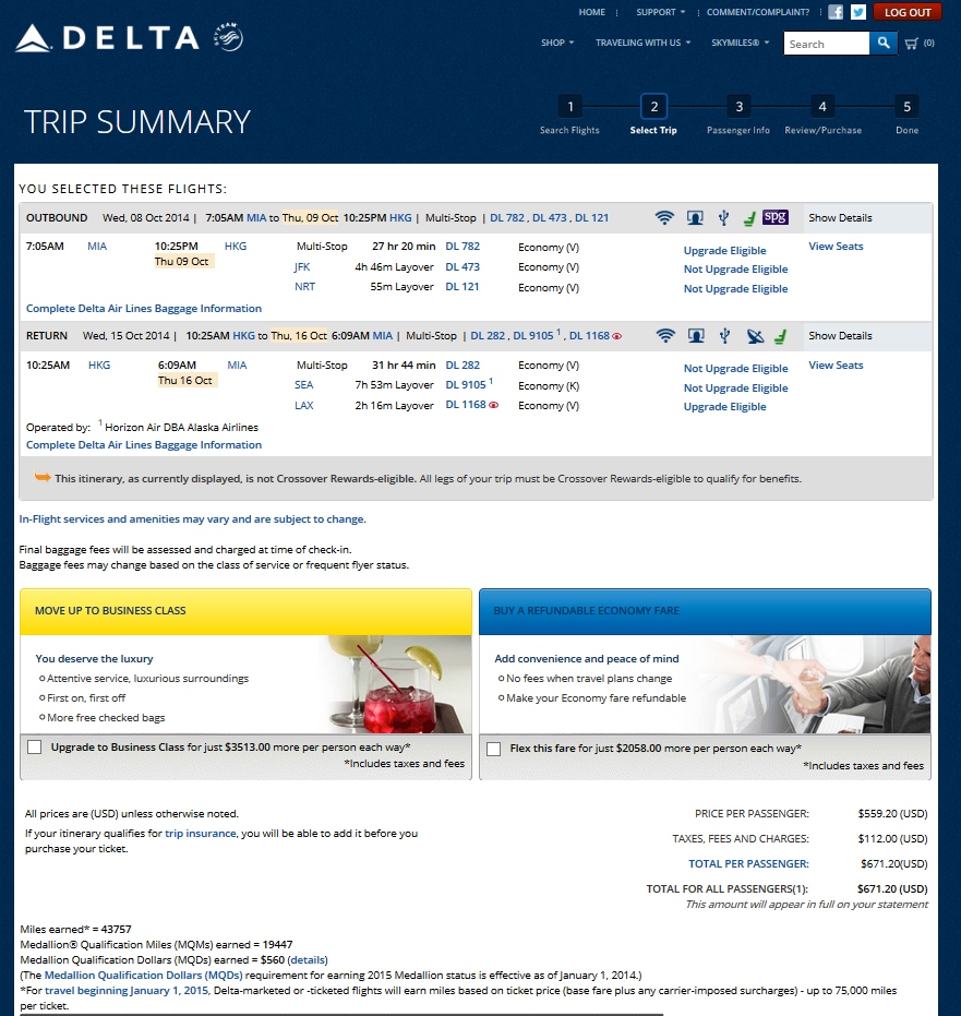 This is nuts. I would not want to spend this much time in coach and it is a vacation run as you must stay a bunch of days in Hong Kong! But the numbers are just a crazy. You can, via this FT thread, look at a bunch of starting airports and drive the price well below 4CPM and get a stupid amount of Skymiles on top of the MQMs. Here are the numbers from MIA!