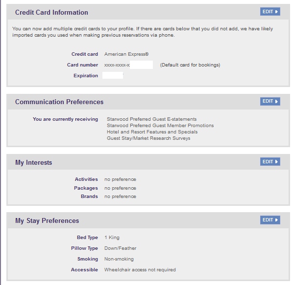 Speaking of SPG, and hotel in general for that matter, did you know a great deal of them have similar choices? I mean things like what type of bed, if you like a high floor or low. Clearly Crossover Rewards is a biggie. Then again here we have things like e-mail preference. I know, I know you get way to much already and this would just be more. Your call but I opt in as I stay at SPG locations all the time (I may opt out from other chains however). As you can see I guess I still have few more I can tweak so SPG can know just what I like. Oh and make sure your current SPG card is on file as well (exp date checked etc).