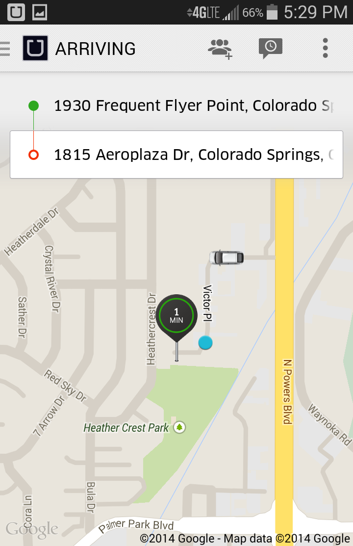 After a great day at the office it was time to request my UBER ride home. at 4:52PM I sent in the request and the driver, according to the app, was just 7 min away. Sweet, it was great to bask in the Colorado sun for few minutes before pickup.