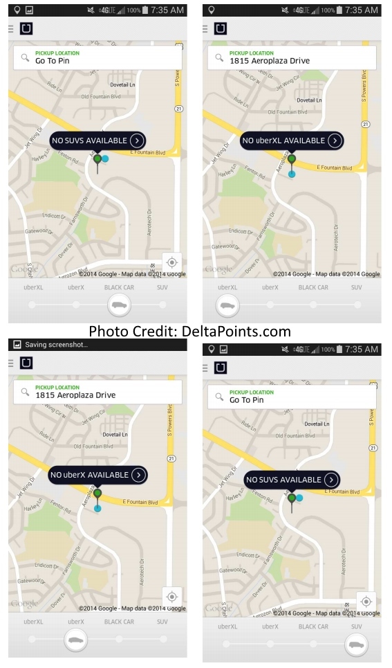 I did not rent a car as it would only cost with UBERx MAX $10 each way from my Holiday Inn Express COS to the HOM. But as you can see, when I got up and started checking it did not look good to get a car to take me for my morning meeting with Randy and the gang. I need not worry after I got ready both UBERx and UBERxl cars were in the area.