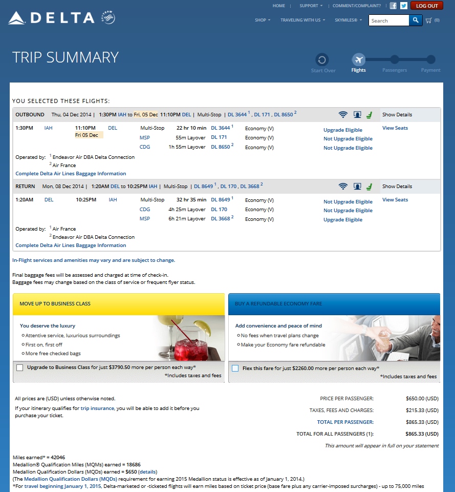 Here is another one from the files of maybe if I were 20 years younger would I consider this much time in coach. But here is why this is not all bad. It is a stupid amount of points in one trip (including Skymiles rebate). You get a weekend in India an then start flight home VERY early local time Monday and fly all, er, day home! Anyway, with a HT to FT, here are the numbers: