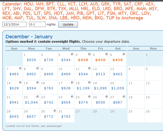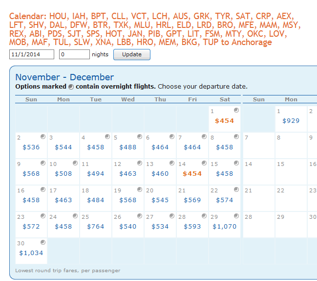 This is one for you weekend only flyers out of AUS. The is a red-eye back but at least you have Sunday afternoon to try to get your body back in shape for work on Monday :-)! The best prices seem to be in NOV but for a little higher CPM you can do DEC as well. Here are the NOV numbers: