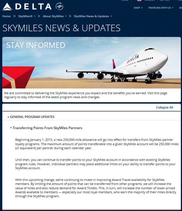 ICYMI or in other words, “in case you missed it” next year, that is as of 1JAN2015, you will only be able to transfer a total, from all kinds of AMEX cards, including cards like the non-Delta AMEX Platinum card as well as SPG cards a grand total of 250,000 per year to each Delta Skymiles account. However, we see no such restrictions on earnings from the CO-branded Delta Skymiles credit card as you can see in the expanded terms and conditions of the cards.